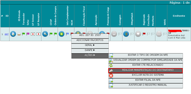 Para realizar a operação “Cancelada localmente” o usuário inicialmente deve identificar uma nota que deseja realizar o processo, clicar com botão direito na nota (ou passar o mouse na estrela em baixo do ID – nas versões anteriores à 1.49.11800)