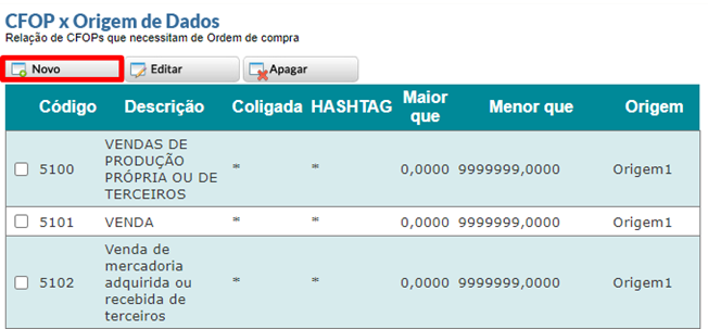 - Criando um novo cadastro de CFOP. Nesta opção devemos clicar em “Novo” na tela de configuração: