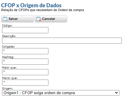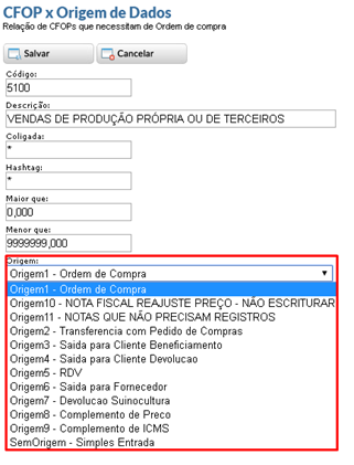 - Origem: Origem que será utilizada para este CFOP.