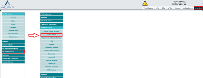 - Acessar o módulo de configurações do ábax, buscar pela aba “Parâmetros Fiscal” e selecionando a opção CFOP x Origem: