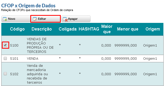 - Editando de um CFOP já cadastrado: O usuário deve selecionar o CFOP que deseja modificar (clicando na check Box à esquerda do código do CFOP) e clicar em editar: