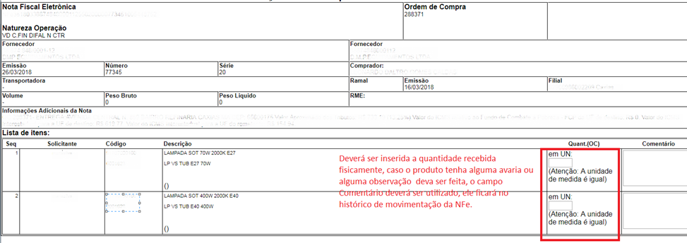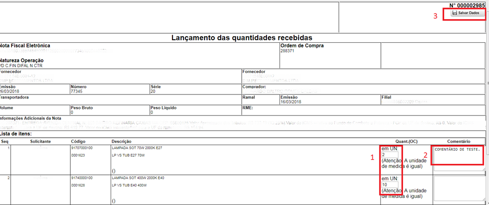 Realize o preenchimento das quantidades e se necessário, os comentários, depois clique em salvar dados.