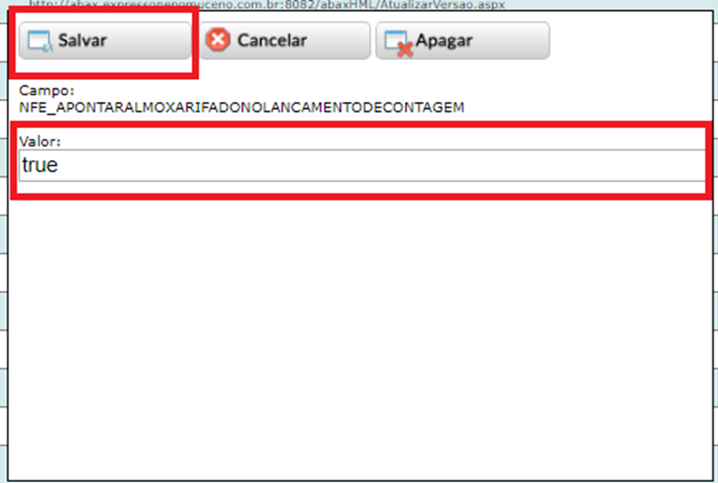 Após clicar em “Novo”, o sistema abrirá uma nova janela para o usuário digitar a Tag e o valor atribuído à ela nos campos “Campo” e “Valor” respectivamente. Clicar em “Salvar”