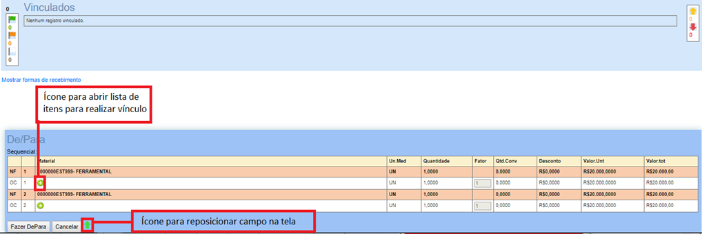 • Manual: O usuário deverá selecionar item a item, começando pelo item a ser vinculado da NF e depois a qual item ele será vinculado, através dos ícones de vínculos (imãs). Após selecionar ambos, o usuário deve informar ao sistema o fator de conversão dos itens, ou seja, cabe ao usuário informar quantos itens dos listados na NF são necessários para formar um único item na OC. Para esclarecer melhor, veja a próxima imagem. Para finalizar o vínculo, clicar em Fazer DePara que aparecerá no canto inferior esquerdo da tela.