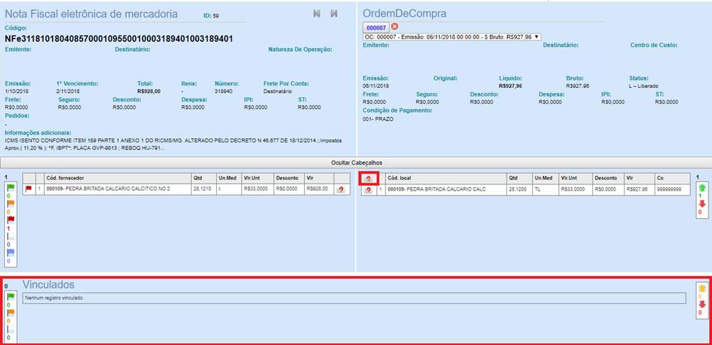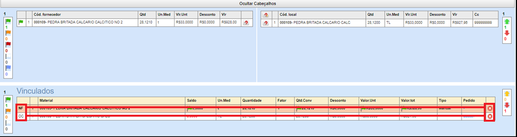 Ao realizar um vinculo também é possível desfazê-lo. Na tela do De/Para no campo “Vinculados” são listados todos os vínculos já realizados na NF, para desvincular basta clicar em “Desfazer vínculo” (ícone do ‘X’ vermelho), sendo que ao clicar no ‘X’ da NF, é desfeito totalmente o vínculo, enquanto ao clicar no ‘X’ da OC é desfeito todos os vínculos com aquele item, mesmo com outro item da NF.