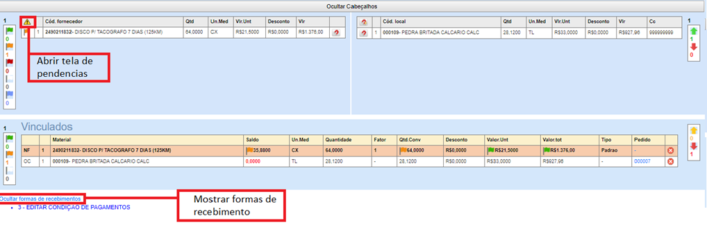 3. Na tela do De/Para quando o Ábax identifica um erro, ele trás para o usuário o erro ao clicar em “Exibir todas as pendências” (ícone do triângulo amarelo com exclamação acima da primeira bandeira de item no lado da NF). Para verificar qual das formas de recebimentos a nota se encaixa, há um botão “Ocultar formas de recebimento”, que serve para ocultar/mostrar este dado