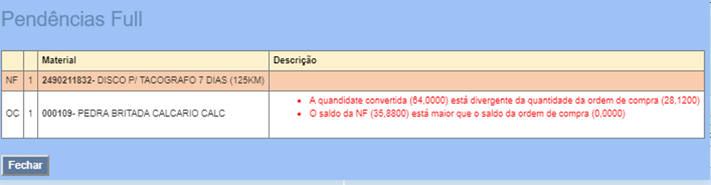 A tela do processo de De/Para é a tela que está sendo explicitada na imagem anterior, nela são comparados todos os valores da NFe e da ordem de compra, afim de bloquear qualquer divergência que venha a ter, serão acatadas todas as margens de preços criadas dentro do ajustes (ver manual de margem de preço).