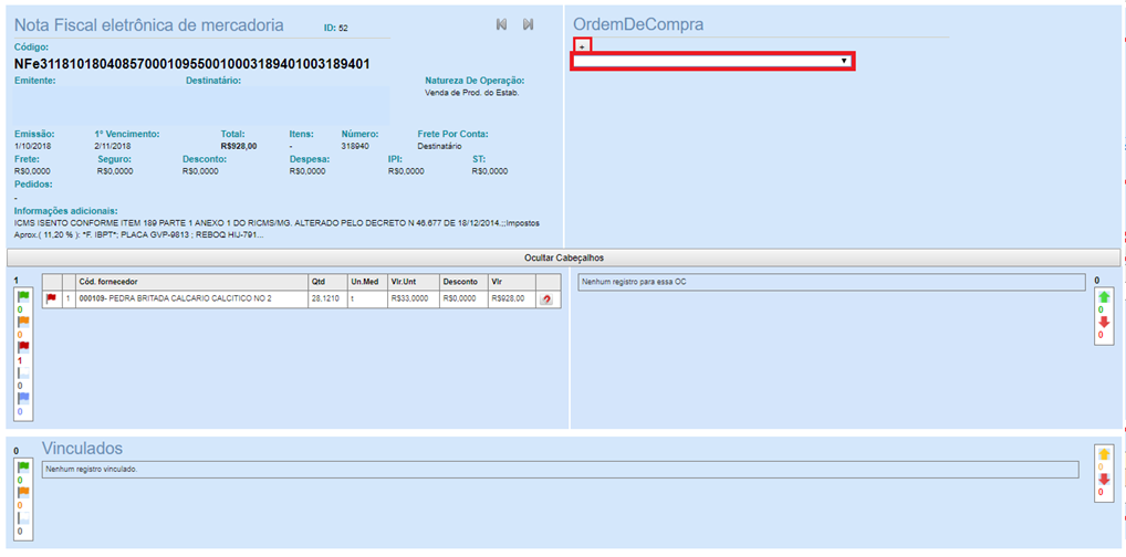 Ao acessar a tela do De/Para é necessário vincular uma ordem de compra à nota para poder realizar o processo. O sistema busca no ERP as Ordens cadastradas para o fornecedor da NF que estejam com status ativo, desta forma, cabe ao usuário selecionar a OC onde a Nota será lançada. Para selecionar a OC deve-se clicar no ícone do mais, no lado da OrdemDeCompra, aparecerá um Drop-Down bem abaixo onde o usuário selecionará a OC.