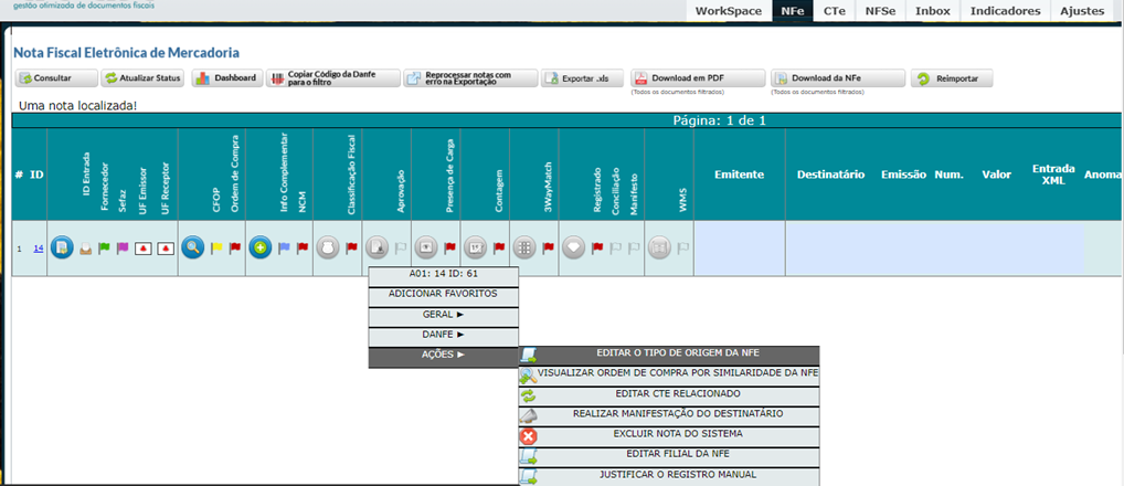 O Ábax também realiza o vínculo de itens quando o item não necessita de ordem de compra, basta realizar a configuração e enquadrar a nota nela. Para enquadrar a NF nesta categoria deve-se clicar com o botão direito sobre a nota, em seguida “AÇÕES” e “EDITAR O TIPO DE ORIGEM DA NFE”.