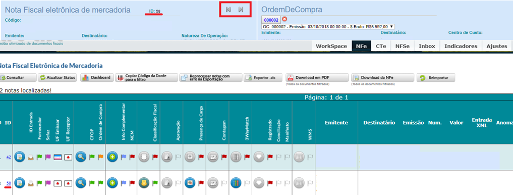 1. Na tela do De/Para há duas setas na parte superior central para que o usuário possa navegar entre as notas do filtro que foi feito na tela