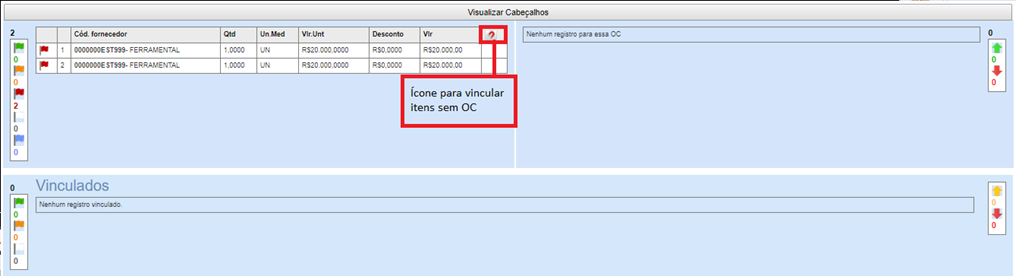Após deve-se clicar no ícone do mais que aparecerá abaixo do item na linha OC, para abrir a tela de pesquisa de itens cadastrados no ERP. A seta verde/vermelha serve para reposicionar o campo de vínculo no(a) topo/base da tela.