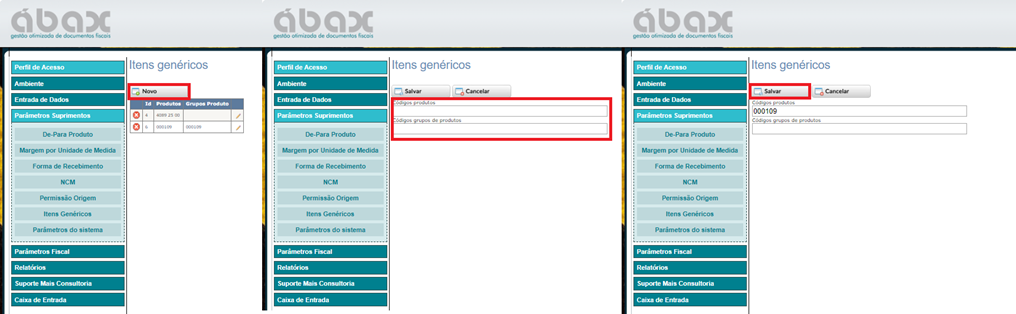 3.1) Inserir novo cadastro: Devemos clicar no botão “Novo” e inserir o código do produto no campo “Códigos produtos”, pode-se ser inserido mais de um item porém, separando-os por ‘;’ (ponto e vírgula). Podemos também definir um grupo de produto como genérico, inserindo o grupo no campo abaixo. Para concluir clicar em “Salvar”.