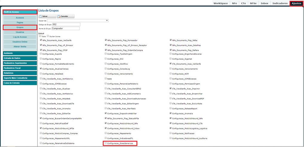 Para que o usuário possa realizar o vínculo DePara de itens genéricos, o mesmo deve possuir a permissão de executar esta tarefa. Para conceder ao usuário tal permissão, deve-se acessar Ajustes > Perfil de Acesso > Grupos e ao escolher o grupo que terá tal permissão, marcar a Box e clicar no botão “Editar” no canto superior da tela. Após isso procurar e selecionar a TAG “Configuracao_ItensGenericos”. Feito isso, clicar em “Salvar”.