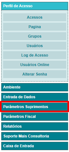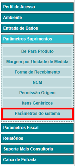 Em seguida é necessário clicar em “Parâmetros Suprimentos” e em seguida em “Parâmetros do Sistema”;