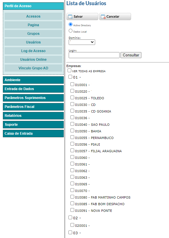 - Acesso a filial do usuário