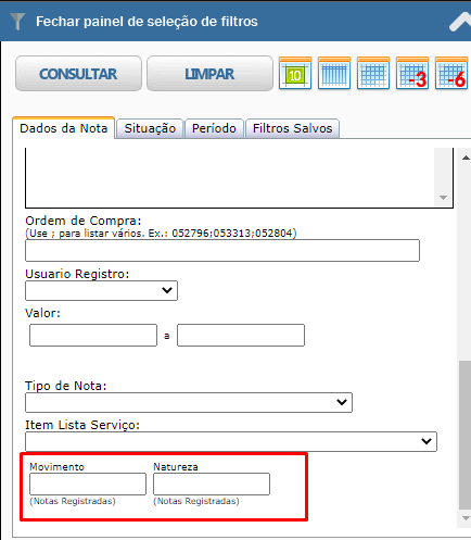 Foi criado o filtro de regra fiscal para notas de produto e replicado para notas de serviço, onde o mesmo irá filtrar as NOTAS JÁ REGISTRADAS NO ERP, do movimento/TES e Natureza do registro do documento. O mesmo deverá ser utilizado com base na TES e natureza da matriz fiscal no momento do registro e não no momento da consulta. Lembrando que será necessário estar utilizando a regra fiscal versão 3 para que o processo funcione corretamente e ao utilizar o filtro das regras fiscais só irá aparecer as notas que já foram registradas via Ábax.