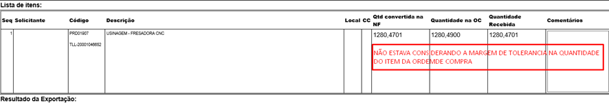 Neste chamado, o Ábax não estava levando em consideração a margem de tolerância da notaXordem de compra na exportação do arquivo dentro do 3Way_Match. Para solucionar, foi realizado o ajuste nos parâmetros da tela que não estava considerando a margem de tolerância.