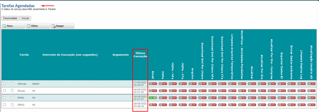 • Última execução nas tarefas agendadas