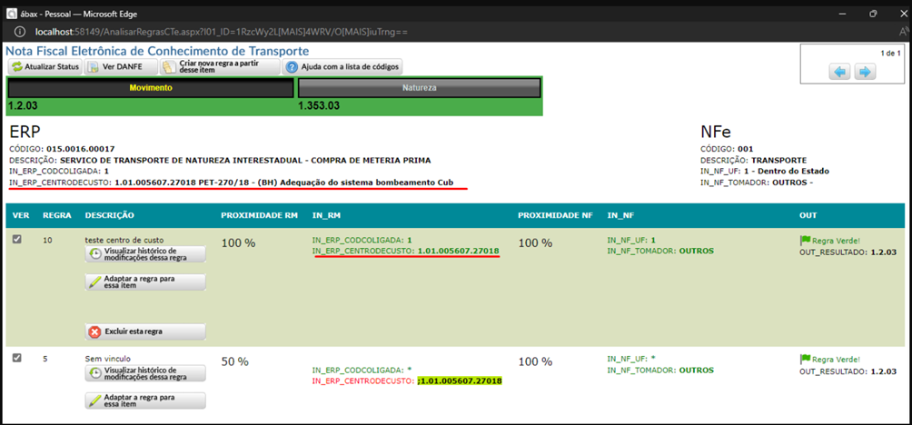 O campo centro de custo na tela de regra fiscal no modulo de CTe, não estava exibindo corretamente o valor inserido na ordem. Foi feita uma mudança na busca da informação e o incidente não mais acontece.