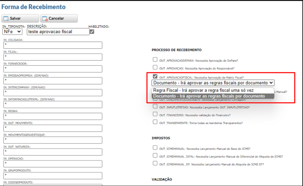 Havia um conflito na aprovação fiscal em que não era exigido o mesmo. Foi realizada uma alteração na forma de recebimento. No campo OUT_APROVACAOREGRAFISCAL, o usuário terá a opção de escolher a aprovação por “Regra”, que irá aprovar a regra fiscal por ID da regra uma só vez, e por “Documento”, que irá aprovar as regras fiscais por documento.