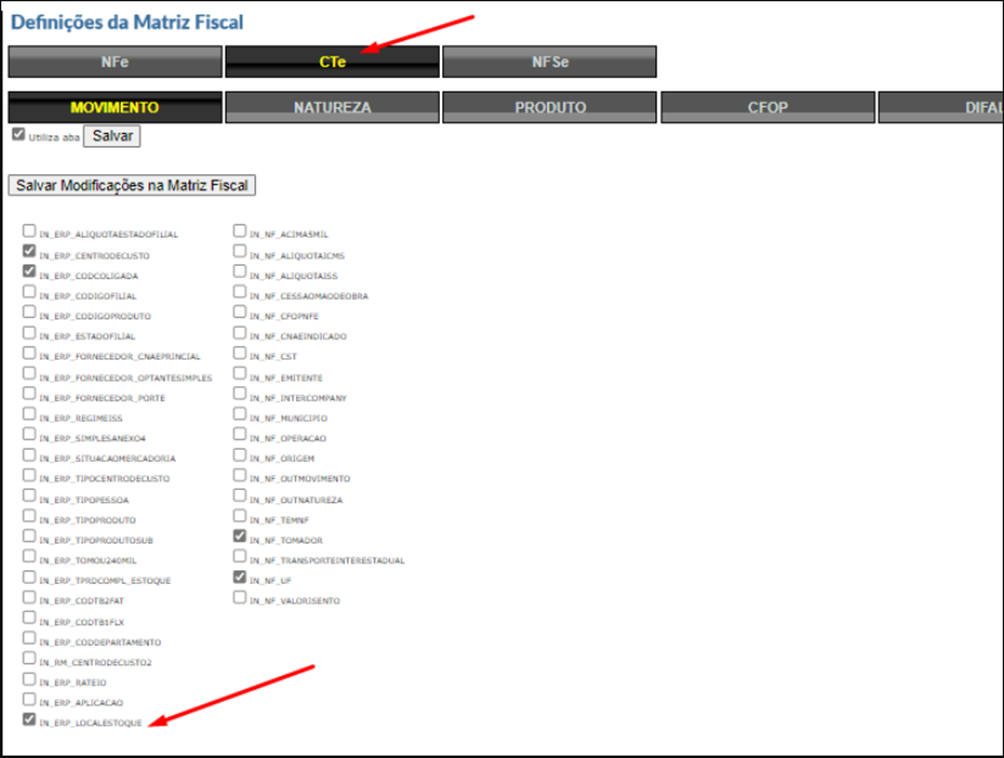 Foi realizada uma melhoria no módulo CTe e criado um novo campo na matriz e classificação fiscal. O campo LOCALESTOQUE, já existente no módulo de produto, agora também está inserido no módulo CTe.