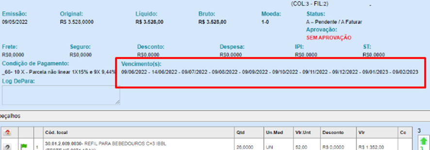 Chamado aberto para correção das ordens de compra com condição de pagamento de mais de uma data de vencimento, onde o Ábax estava exibindo somente a primeira data. Alterado para que as demais datas sejam exibidas.