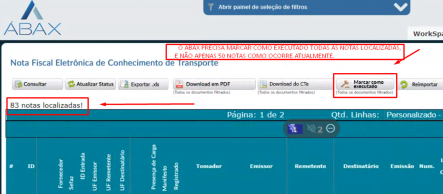 No módulo CTe, ao clicar em ‘Marcar como executado’, o Ábax realizava a ação em 50 notas. Porém, quando havia mais notas filtradas, o usuário ficava confuso sobre em quais CTe’s a ação havia sido executada. Para solucionar, o Ábax foi ajustado para realizar a ação em todos os CTe’s filtrados, além da inserção de uma barra de progresso para o usuário acompanhar o processo.