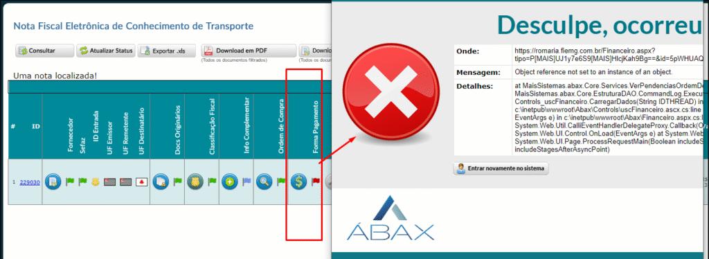 Na aba CTe, a tela de forma de pagamento estava indisponível o acesso devido a um erro. Foram realizados os ajustes necessários e o erro não mais acontece.