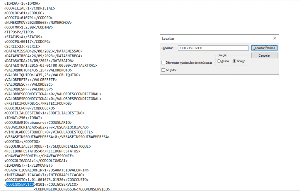 Foi adicionado o campo “CODIGOSERVICO” para a tabela “TITMMOV” para NFSe sem OC. Com iss, foi alterada a classe “NFSeSemOrdemDeCompra_TagTITMMOV” para enviar o código do serviço que está no Ábax. Portanto, foi adicionada tag <CODIGOSERVICO> na exportação para NFSe sem ordem de compra.