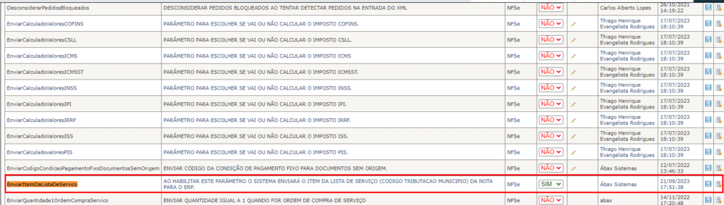 Foi identificado que o sistema ábax está enviando o conteúdo da TAG <CodigoServico> de forma incorreta, utilizando o campo “B04_CODIGOTRIBUTACAOMUNICIPIO” em vez do campo “B02_ITEMLISTASERVICO”. Portanto, o envio deve ser habilitado pelo parâmetro “EnviarItemDaListaDeServico”, seguindo essa lógica para notas fiscais de serviço, tanto com quanto sem Ordem de Compra (OC).