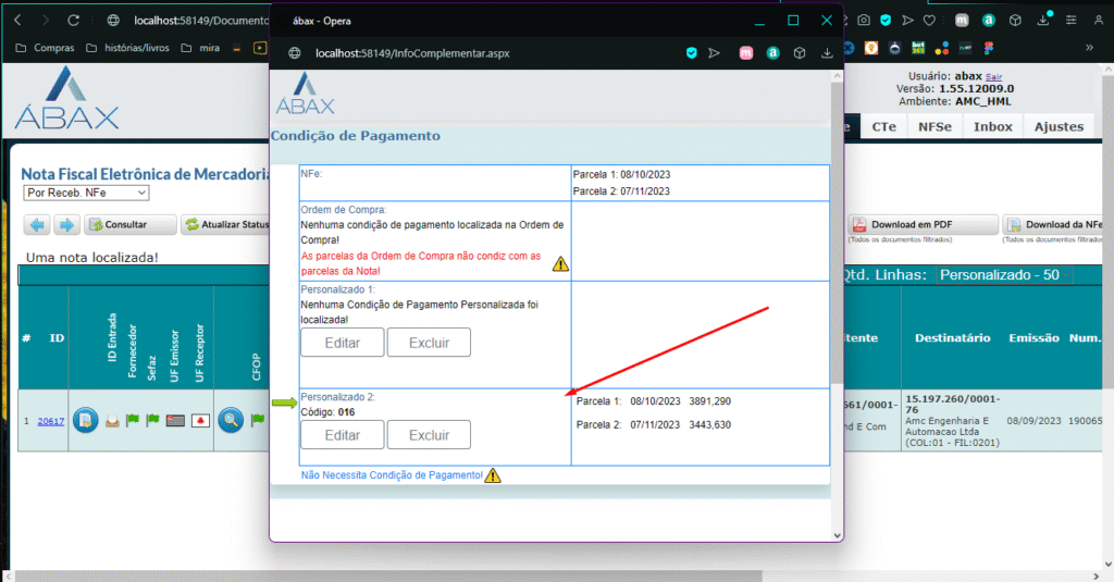 Identificou-se que a condição de pagamento estava sendo enviada de acordo com a Nota Fiscal Eletrônica no modo Personalizado. Diante disso, solicitamos o desenvolvimento de um parâmetro que execute uma verificação de pendências, a fim de garantir que a customização seja aplicada de maneira correta e exportada com sucesso.