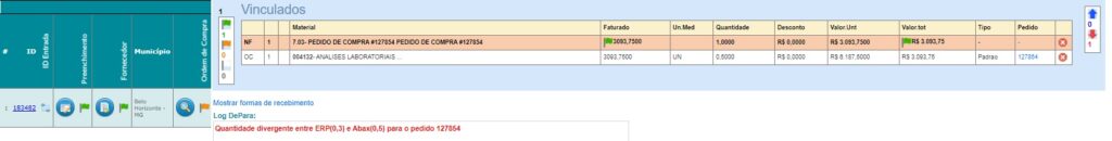 Foi identificado que o ábax não estava exibindo o valor do frete no pedido de compras, na tela do de/para. Com isso, foi ajustado a busca do valor do frete para o “RFC” correto, com isso o valor foi exibido corretamente na tela do de/para.