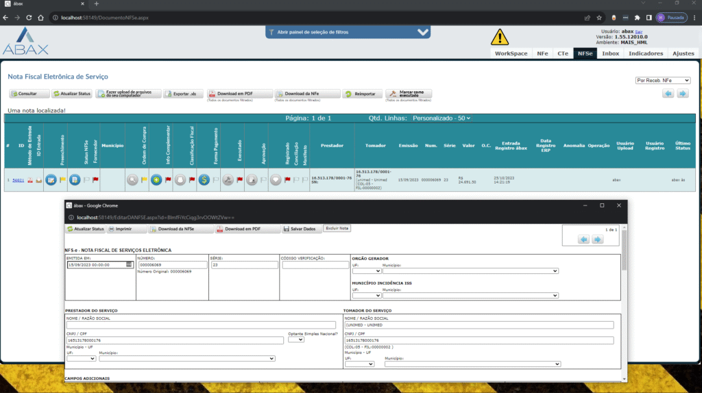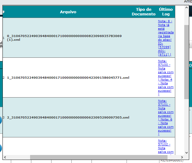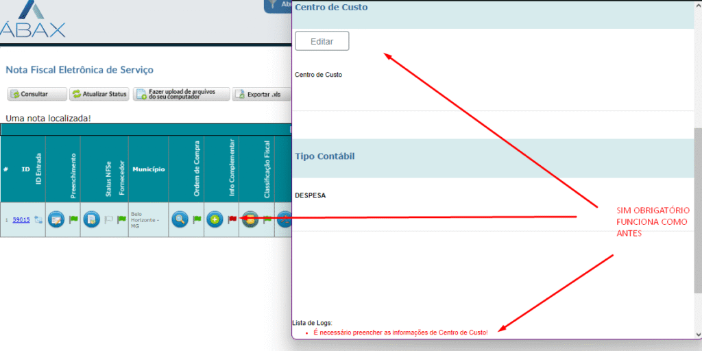 Identificamos um problema de importação relacionado a uma nota que consta como cancelada na Prefeitura de Belo Horizonte em nosso ambiente. Com isso, a nota não está sendo importada no Abax e não há nenhuma mensagem ou notificação de retorno. Portanto, foi adicionado log ao importar a nota, informando que a nota está cancelada e adicionado campo “JUSTIFICATIVA” no log da tela “VIEWDANFSE”.