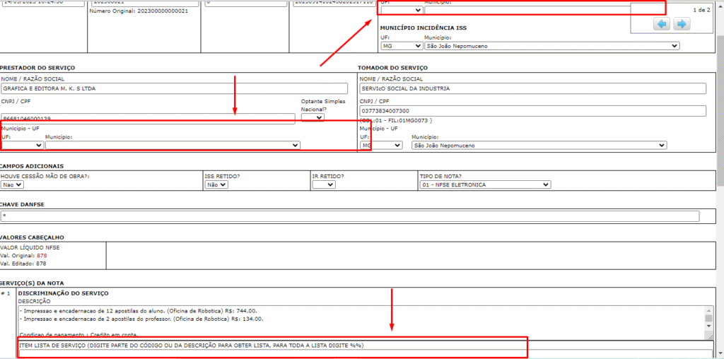 Foi identificado erro que estava acontecendo pois o campo de Item da lista de serviço estava na verdade sendo preenchido com a descrição do serviço, fazendo com que não fosse possível identificar o serviço prestado e sendo salva sua descrição no campo de código.
