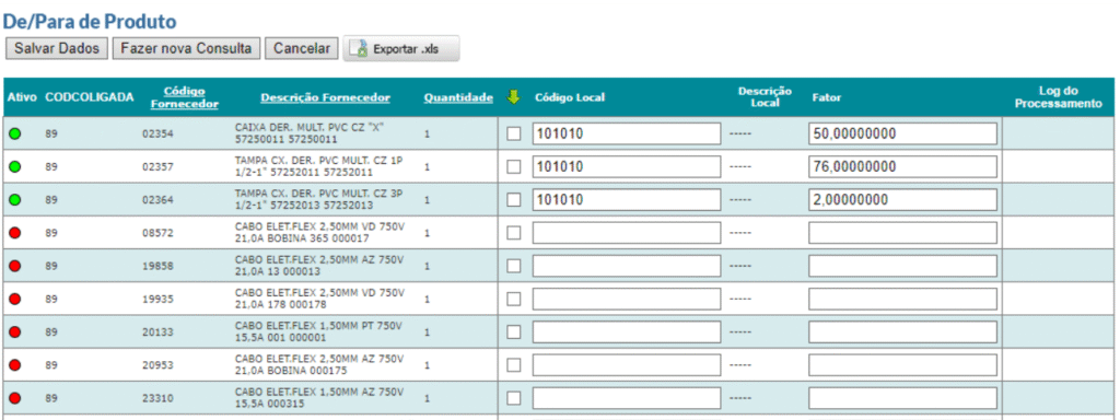 • Vínculo De/Para Produtos