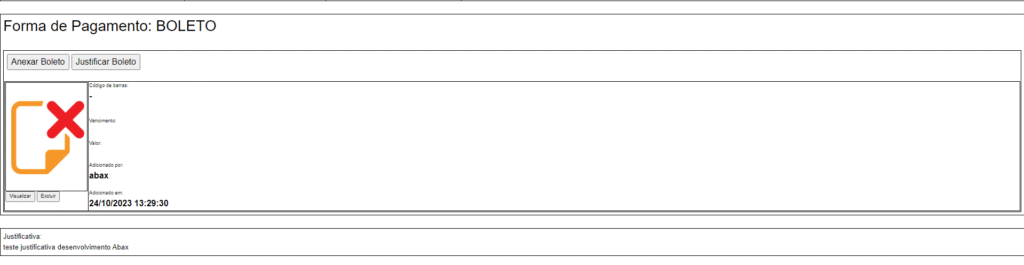Foi identificado dentro da plataforma, ao excluir o boleto, a necessidade de atualização do mesmo para que seja realizada uma trava no registro quando nenhum boleto estiver anexado. A forma de recebimento solicitou obrigatoriedade e, como solução, foi adicionado um botão para remover a obrigatoriedade do boleto após uma justificativa.
