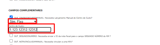 Implementado melhoria na Forma de Recebimento na opção OUT_CENTRODECUSTOMANUAL, foi inserido a opção “Sim, fixo”, quando essa é a escolhida, o usuário poderá informar um centro de custo padrão para determinado tipo de nota fiscal. Este centro de custo será enviado para todos os itens da nota fiscal.