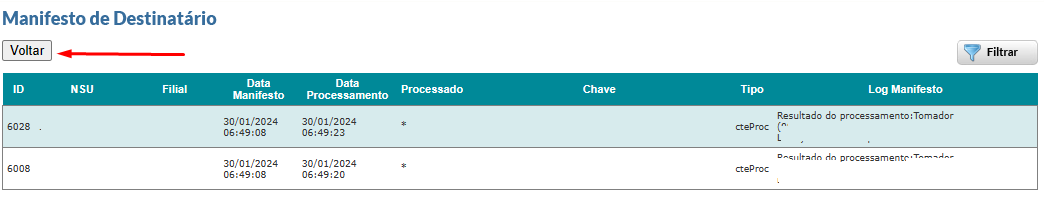 • Botão Voltar na tela de Acompanhamento de Manifesto