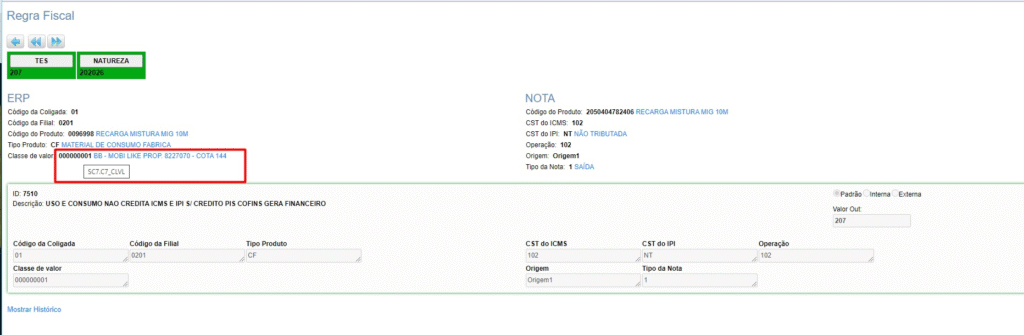 Foi adicionado o campo ‘IN_ERP_CLASSEVALOR’ na Matriz Fiscal para que seja informada a Classe de Valor do item do pedido de compra. Nas telas da matriz de NFe e NFSe, o campo será exibido como Classe de Valor, pois é o padrão da tela. Já para CTe, o padrão da tela é diferente e será exibido IN_ERP_CLASSEVALOR.