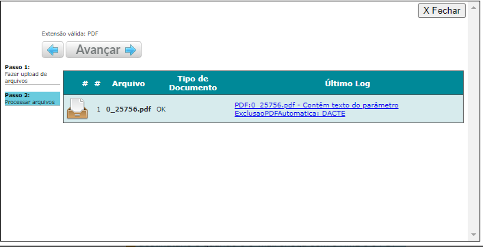 Foi identificado que o documento é um CTe. Para evitar a entrada do arquivo, foi necessário incluir o texto “DACTE” como um dos parâmetros dentro do parâmetro ExclusaoPDFAutomatica. Além disso, foram identificadas e corrigidas possíveis exceções não tratadas. A LOG foi ajustada para exibir “OK” somente se o documento for processado corretamente. Qualquer erro no processo agora será informado ao usuário.
