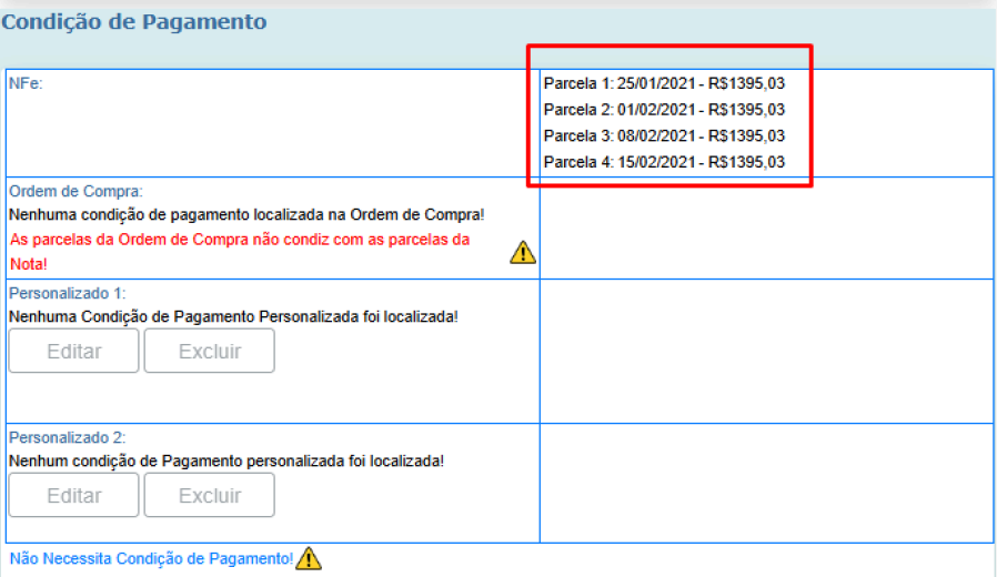 • Valor das parcelas na tela de Informação Complementar