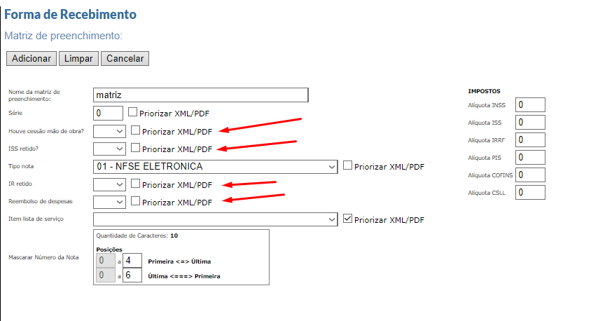 Foi criada a caixa de seleção Priorizar XML/PDF para os itens que faltavam na matriz de preenchimento, sendo eles Cessão de Mão de Obra, ISS e IR Retido e Reembolso de Despesas.